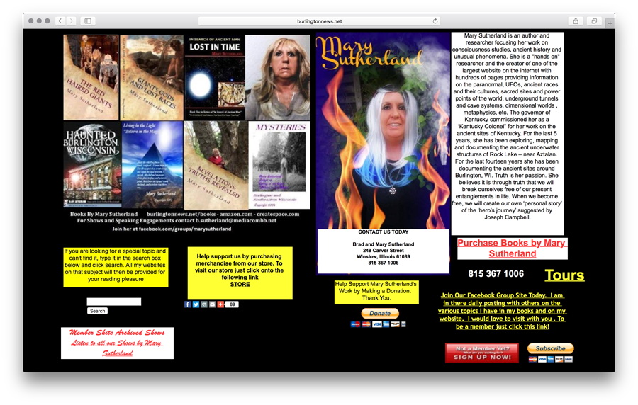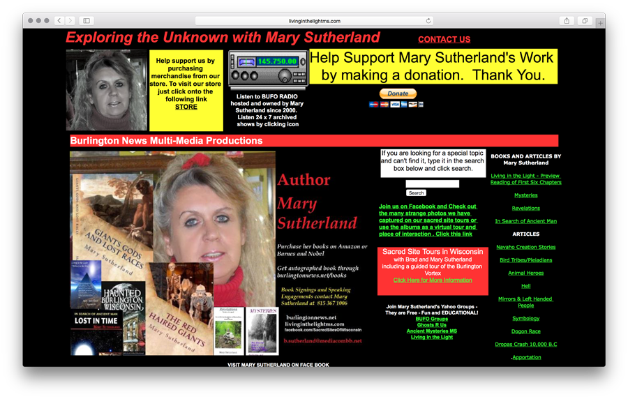 The truth is out there, and it can be found at burlingtonnews.net. Introducing Mary Sutherland: author, alternative archaeologist, and astrophysicist, specializing in cryptid anthropology, codes, theology, consciousness studies, and the physics of the multi-dimensional worlds. From real alien documentation, to haunted houses of Wisconsin, this site will make a believer out of you. Burlington News is a real challenge to navigate, but that's the price one must pay to uncover the secrets of this world and the next.