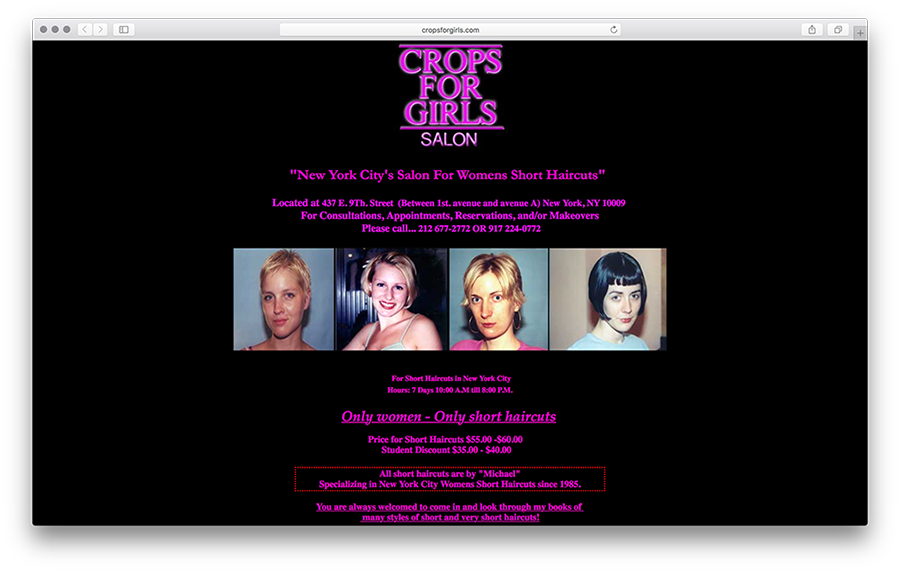 Crops for Girls is a New York salon specializing in short haircuts for women. The site features an extensive gallery of slightly haunting before and after images, presenting these women and their momentary hair conquests within a vast black field.