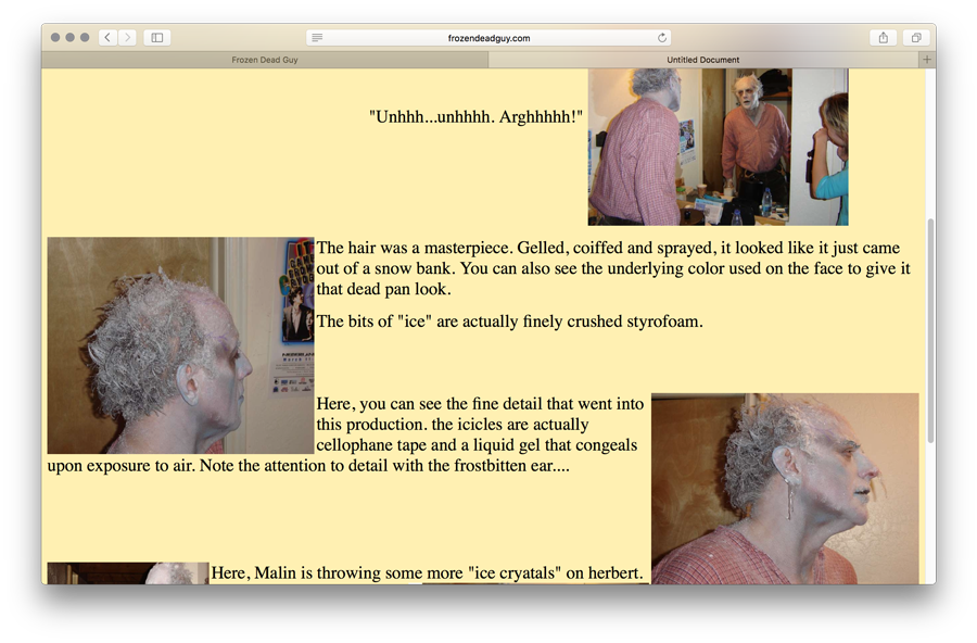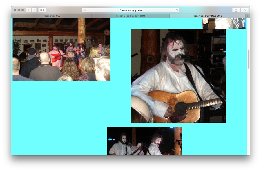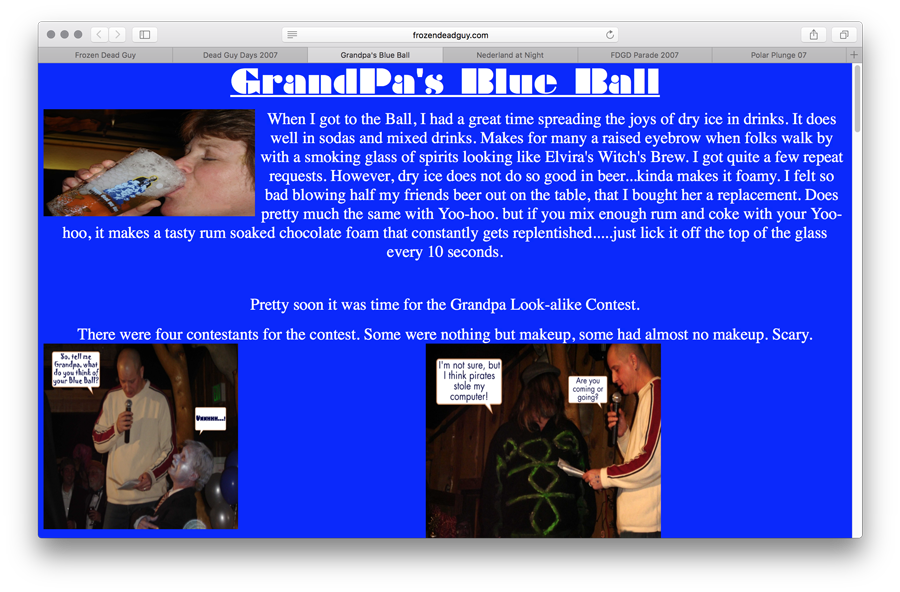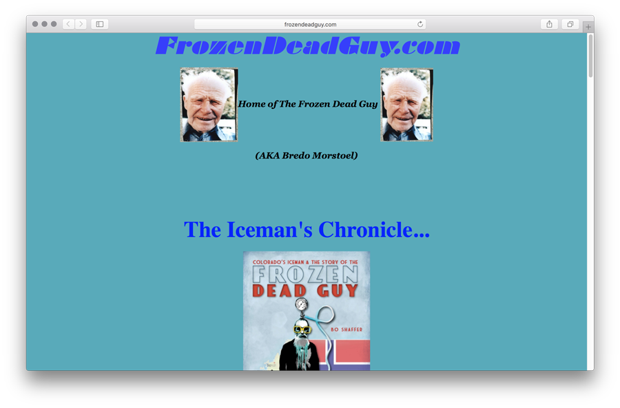 Frozendeadguy.com: the tale and subsequent festivities surrounding a cryogenically frozen man in Nederland, Colorado. This is the raw chronicle of Frozen Dead Guy’s caretaker: “The Iceman.” A local hero, he is the only man brave enough to venture into Grandpa Bredo’s resting place (a padlocked shed in the backyard) to replenish Bredo’s dry ice supply AND live to make a website about it. With pages that border on concrete poetry, there is a surprising artistry to The Iceman’s yarn.