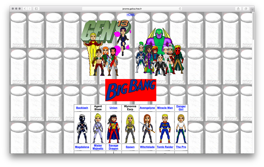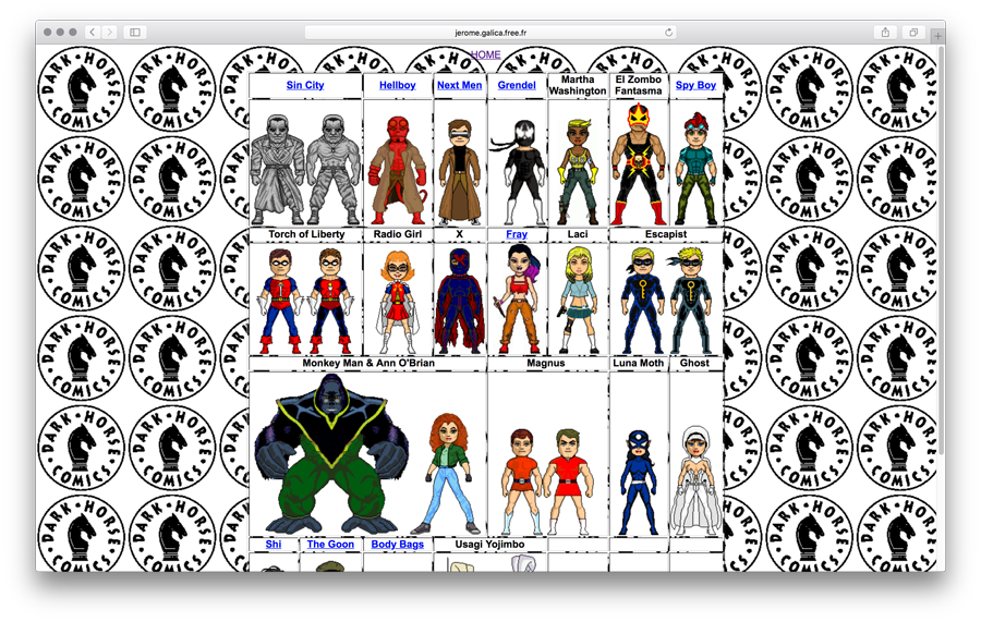 Your favorite miniature heroes, now all in one place, all in one pose. You may want to know "why?", but leave your questions at the door. You will not find any answers diving deep into jerome.galica.free.fr, only more and more carefully rendered MS paint micro heroes. Let the existential calm of repetition and uniformity wash over you and remember: We are all one.