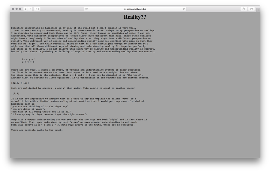 Shadow Software truly has something for everyone. Want a refresher on the fundamental teachings of Buddhism? Learn how to hook up an iPod to a TV? Listen to basement jam sessions? Shadow Software holds many mysteries for those brave enough to navigate this labyrinth-like portrait of the programmer only known as "Strider."