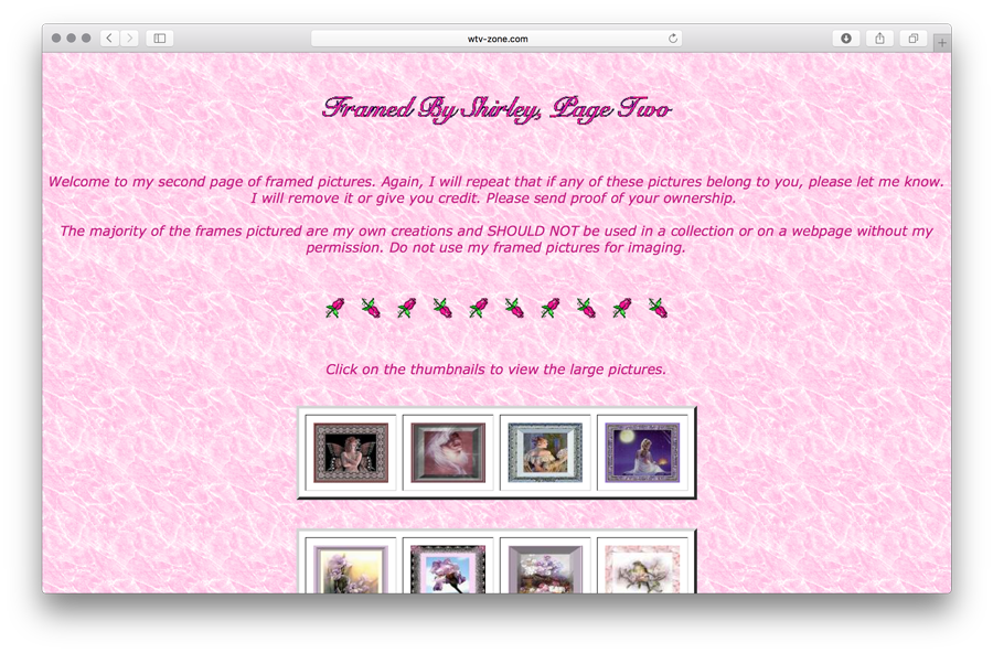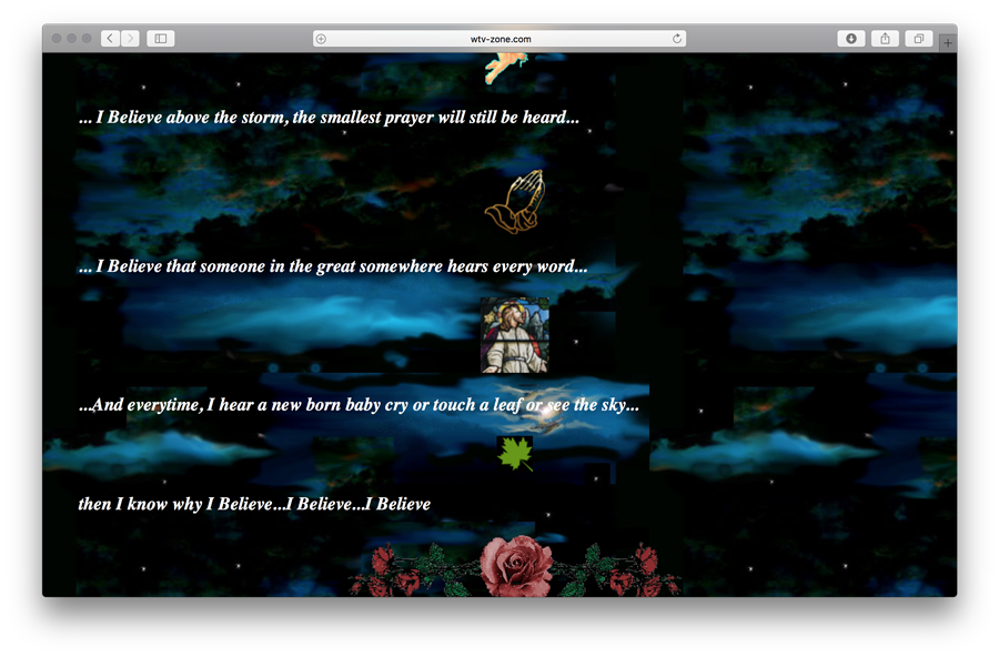 More than just a website, wtv-zone is a treasure trove of mini sites created by a diverse community of users. Visit member’s “Zone Homes” to access vintage gif galleries, midi discographies, flash games, and digital memoirs preserved perfectly as they were in the early 2000s. To a true digital archeologist, wtv-zone is paradise—a museum, playground, and graveyard of the early web wrapped in a sparkly, animated bow.